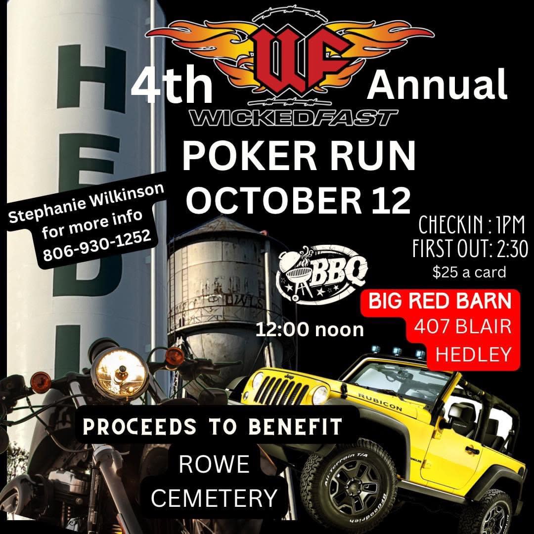 The 2025 Hedley Cotton Festival will be held Friday and Saturday, October 10 and 11, with food, music, and fun for the whole family. A chili supper at the Hedley Senior Citizens will kick things off Friday at 5 p.m. Saturday's activities start with all-day bingo starting at 9:00 at the senior citizens. A corn hole tournament will start at 10:00, the kiddie parade will be at 11 a.m. on Main Street followed by the big parade at 2:00 p.m. The Wicked Fast Poker Run will have check-ins starting at 1:00 and first-outs at 2:30. Hedley ex-students will reunite at the school at 3:00, and drawings for several fundraisers will be held at 6:00 p.m.Images