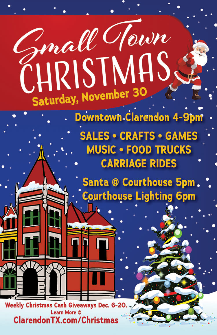 SHOP SMALL with Clarendon Merchants all day and enjoy the Small Town Christmas festival, including Santa Claus at the Donley County Courthouse at 5 p.m. and the Courthouse Lighting Ceremony at 6 p.m.Images